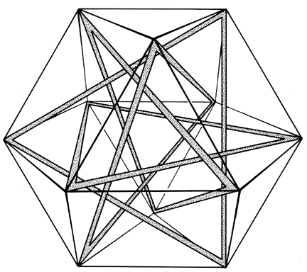 Fig. 1033.019 Circuit Pattern Tensegrity: In Anthony Pugh’s model 12 struts form four interlocking but nontouching triangular circuits. The plane of each triangle of struts bisects the vector equilibrium which its vertexes define. Each triangle of struts is inscribed within a hexagonal circuit of tensors.