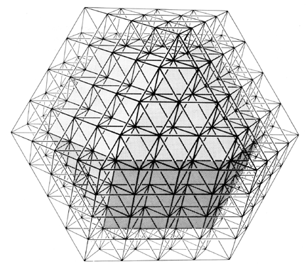 Fig. 1074.13 Nuclear Structural Systems: Nuclear structural systems consist entirely of tetrahedra having a common interior vertex. They may be interiorly truncated by introducing special case frequency. which provides chordal as well as radial modular subdivisioning of the isotropic-vector-matrix intertriangulation. while sustaining the structural rigidity of the system.