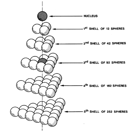 Fig. 419.30 Realized Nucleus Appears at Fifth Shell Layer: In concentric closest packing of successive shell layers potential nuclei appear at the third shell layer, but they are not realized until surrounded by two shells at the fifth layer.