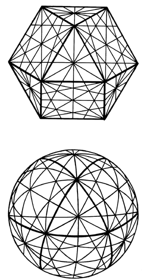 Fig. 450.11B Projection of 25 Great-Circle Planes in Vector Equilibrium Systems: The complete vector equilibrium system of 25 great-circle planes, shown as both a plane faced-figure and as the complete sphere (3 + 4 + 6 + 12 = 25). The heavy lines show the edges of the original 14-faced vector equilibrium.