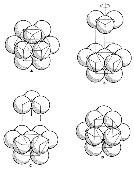A. Twelve Closest-packed Spheres around One: Symmetrical nuclear vector equilibrium. B. Twelve Closest-packed Spheres around One: Rotation of top triangular group. C. Twelve Closest-packed Spheres around One: Alternate nestability in polar triangular valley. D. Twelve Closest-packed Spheres around One: Alternate polarized symmetry of vector equilibrium.
