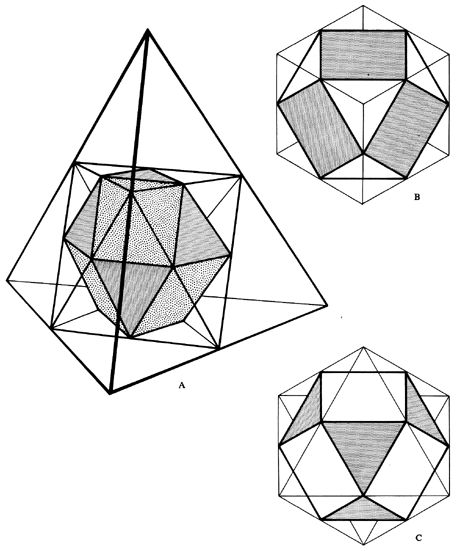 Fig. 470.02B. Relationship of Vector Equilibrium to Cube and Octahedron: A. Joining and interconnecting the midpoints of tetrahedron edges results in the octahedron. Joining and interconnecting the midpoints of the octahedron edges results in the vector equilibrium. B. Relationship of the vector equilibrium to cube. C. Relationship of vector equilibrium to octahedron.