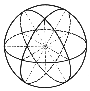 Fig. 541.30M Gradually the four tetrahedron-defining, vertexial components of the photon package’s spiralling results in an equilibrium-seeking interaction of their four separate interattractions, which generates the four great circles of the vector equilibrium and establishes its tactical energy center as the four planes of the zerophase tetrahedron.