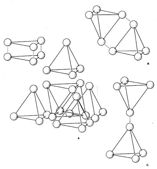 Fig. 987.081 Trivalent Bonding of Vertexial Spheres Form Rigids: At C: Gases are monovalent, single- bonded, omniflexible, inadequate-interattraction, separatist, compressible. At B: Liquids are bivalent, double-bonded, hinged, flexible, viscous integrity. At A: Rigids are trivalent, triple-bonded, rigid, highest tension coherence.