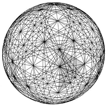 Fig 987.137B Composite of Primary and Secondary Vector Equilibrium Great Circle Sets: This is a black-and-white version of color plate 16. The Basic Equilibrium 48 LCD triangle as presented at Fig. 453.01 appears here shaded in the spherical grid. In this composite vector equilibrium spherical matrix all the 25 primary great circles appear together with the four sets of secondary great circles. (The four sets of secondary vector equilibrium great circles are shown successively at color plates 12-15.)