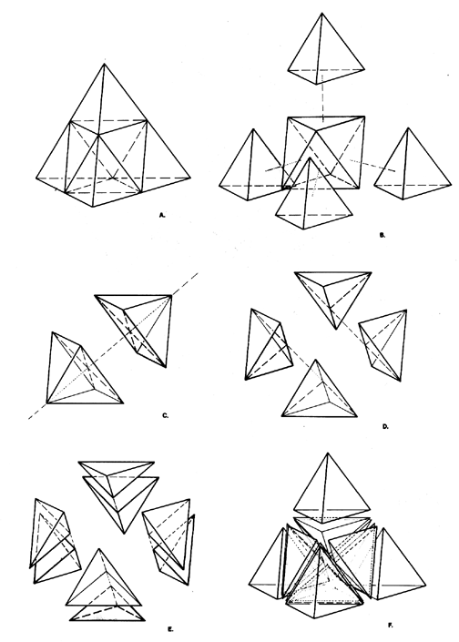 Fig. 987.210 Subdivision of Tetrahedral Unity: Symmetry #1: A. Initial tetrahedron at two-frequency stage. B. Tetrahedron is truncated: four regular corner tetra surround a central octa. The truncations are not produced by great-circle cleavages. C, D, and E show great-circle cleavages of the central octahedron. (For clarity, the four corner tetra are not shown.) Three successive great-circle cleavages of the tetrahedron are spun by the three axes connecting the midpoints of opposite pairs of the tetra’s six edges. C. First great-circle cleavage produces two Half-Octa. D. Second great-circle cleavage produces a further subdivision into four irregular tetra called “Icebergs.” E. Third great-circle cleavage produces the eight Eighth-Octahedra of the original octa. F. Eight Eighth-Octa and four corner tetras reassembled as initial tetrahedron.