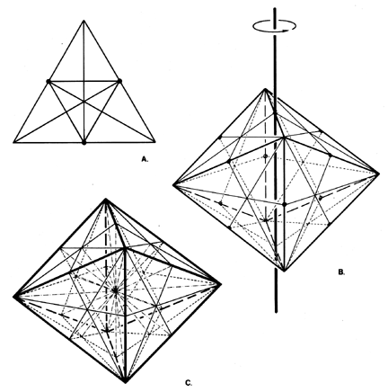 Fig. 987.240 Subdivision of Tetrahedral Unity: Symmetry #3: Subdivision of Internal Octahedron: A. Bisection of tetrahedron face edges describes a congruent octahedron face. B. The spinning of the internal octahedron on axes through the opposite mid-edges generates the six great circle system of Symmetry #3. C. The six great circle fractionations subdivide the octahedron into 48 Asymmetric Tetrahedra; each such Asymmetric Tetrahedron is comprised of one A Quanta Module and one B quanta Module. D. Exploded view of octahedron’s 48 Asymmetric Tetrahedra.