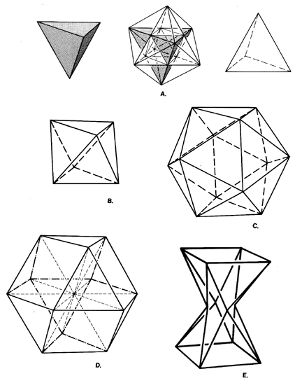 Fig. 987.242 Evolution of Duo-Tet Cube and Hourglass Polyhedron: A. One positive regular tetrahedron and one negative regular tetrahedron are intersymmetrically arrayed within the common nuclear-vertexed location. Their internal trussing permits their equi-inter- distanced vertexes to define a stable eight-cornered structure, a “cube.” The cube is tetravolume-3; as shown here we observe 1 1/2-tetravolumes of “substance” within the eight vertexes and 1 1/2- tetravolumes of complementation domain within the eight vertexes . The overall cubic domain consists of three tetravolumes: one outside-out (1 1/2) and one inside-out (1 1/2). The same star polyhedron appears within a vector equilibrium net at Fig. 1006.32. B. Octahedron: tetravolume-4 C. Icosahedron; tetravolume- 18.51229586 D. Vector equilibrium: tetravolume-20 E. Eight-faceted asymmetric Hourglass Polyhedron: tetravolume-l l/2. These complex asymmetric doughnut-cored hexahedra appear within the star polyhedron at A.